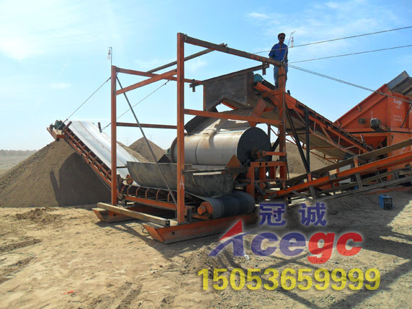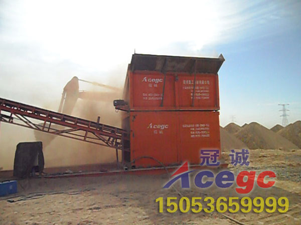 臥式干選機分兩種,一種是帶尾料輸送桿的,采用一臺裝載機上料,廢料用尾料輸送桿輸送出去,使用于4米左右沙層,上料高度為3.7米,裝載機可以直接上料不用助坡。另外一種是不帶尾料輸送帶,尾料用裝載機清除走,整機要用兩臺裝載機,上料高度為3.7米,裝載機可以直接上料不用助坡。整機用電45kw.2