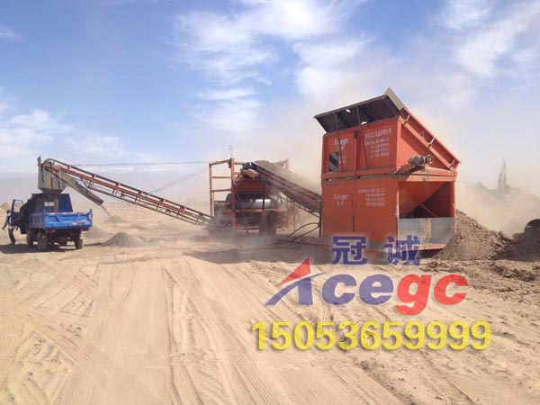 臥式干選機分兩種,一種是帶尾料輸送桿的,采用一臺裝載機上料,廢料用尾料輸送桿輸送出去,使用于4米左右沙層,上料高度為3.7米,裝載機可以直接上料不用助坡。另外一種是不帶尾料輸送帶,尾料用裝載機清除走,整機要用兩臺裝載機,上料高度為3.7米,裝載機可以直接上料不用助坡。整機用電45kw.2