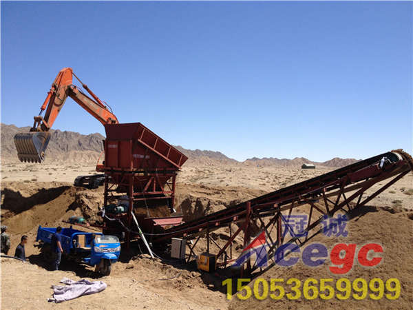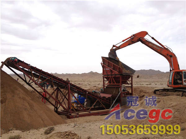 特種干選機采用挖掘機上料,廢料用輸送桿輸送走,使用于3米左右沙層,上料高度為4.5米,裝載機可以直接上料不用助坡。整機用電量為45kw左右。